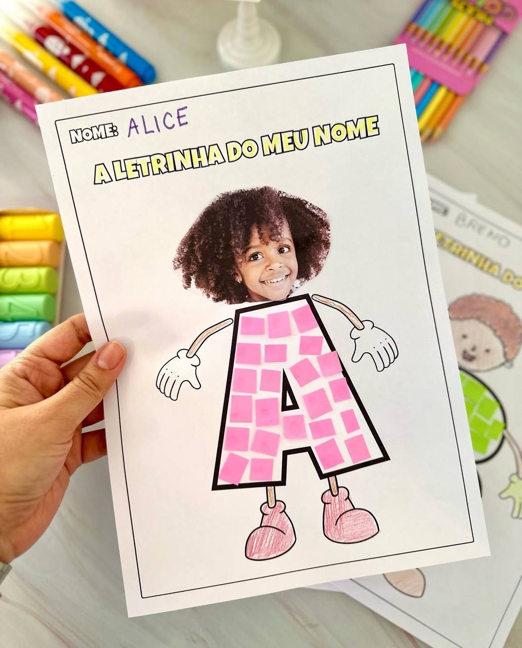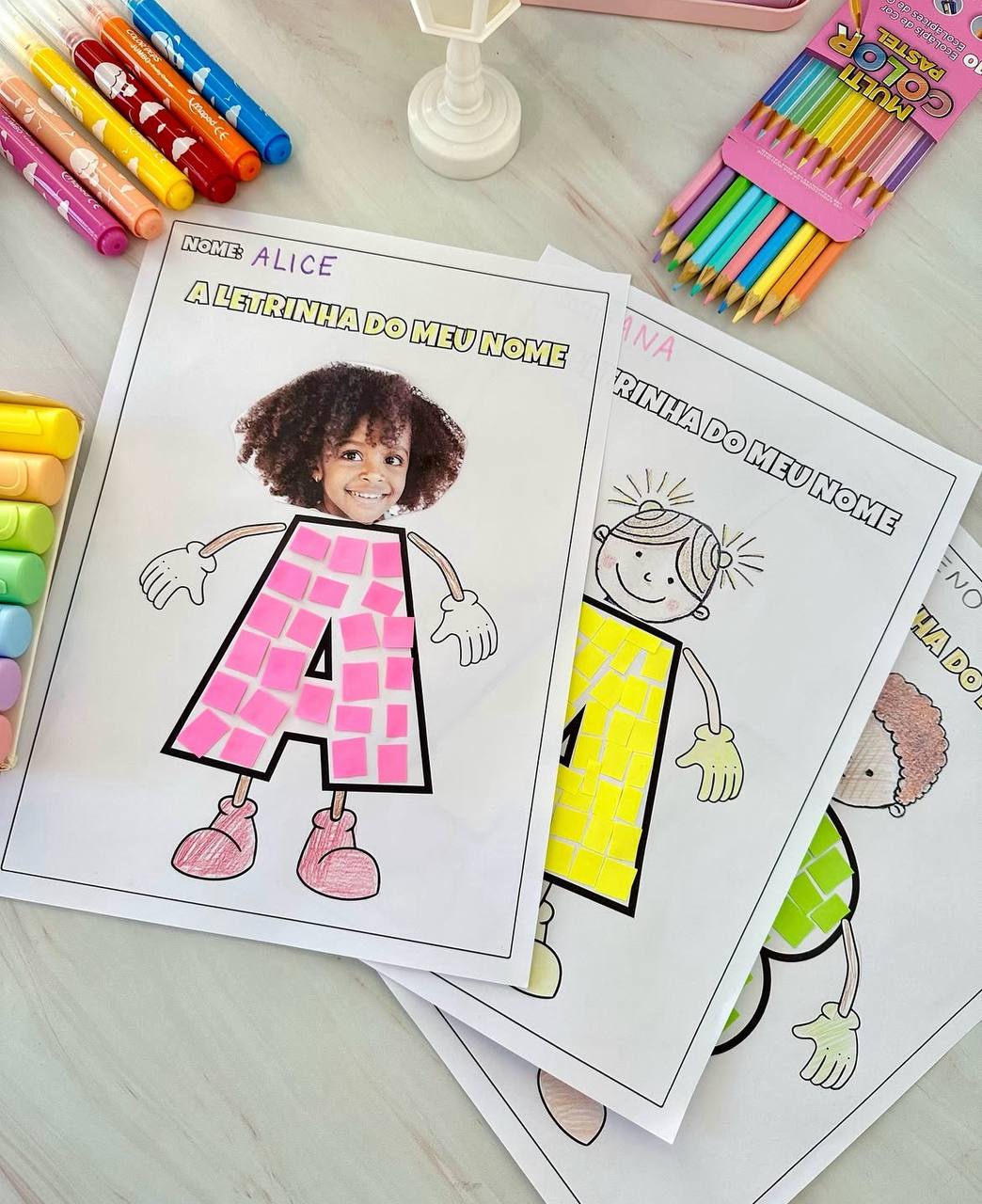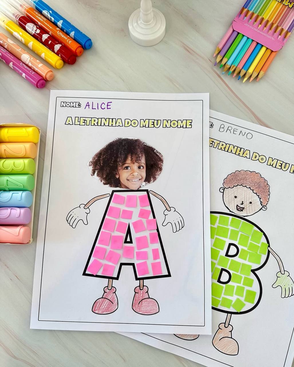 Para realizar esta proposta será necessário imprimir a foto do rosto da criança ou pedir para fazer o desenho. E para preencher a letra podemos utilizar papel colorido, tinta, barbante ou outros materiais disponíveis..