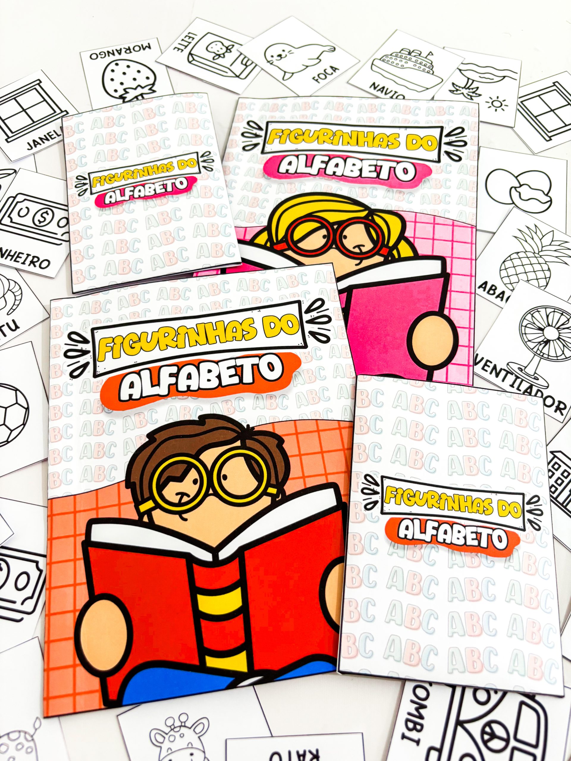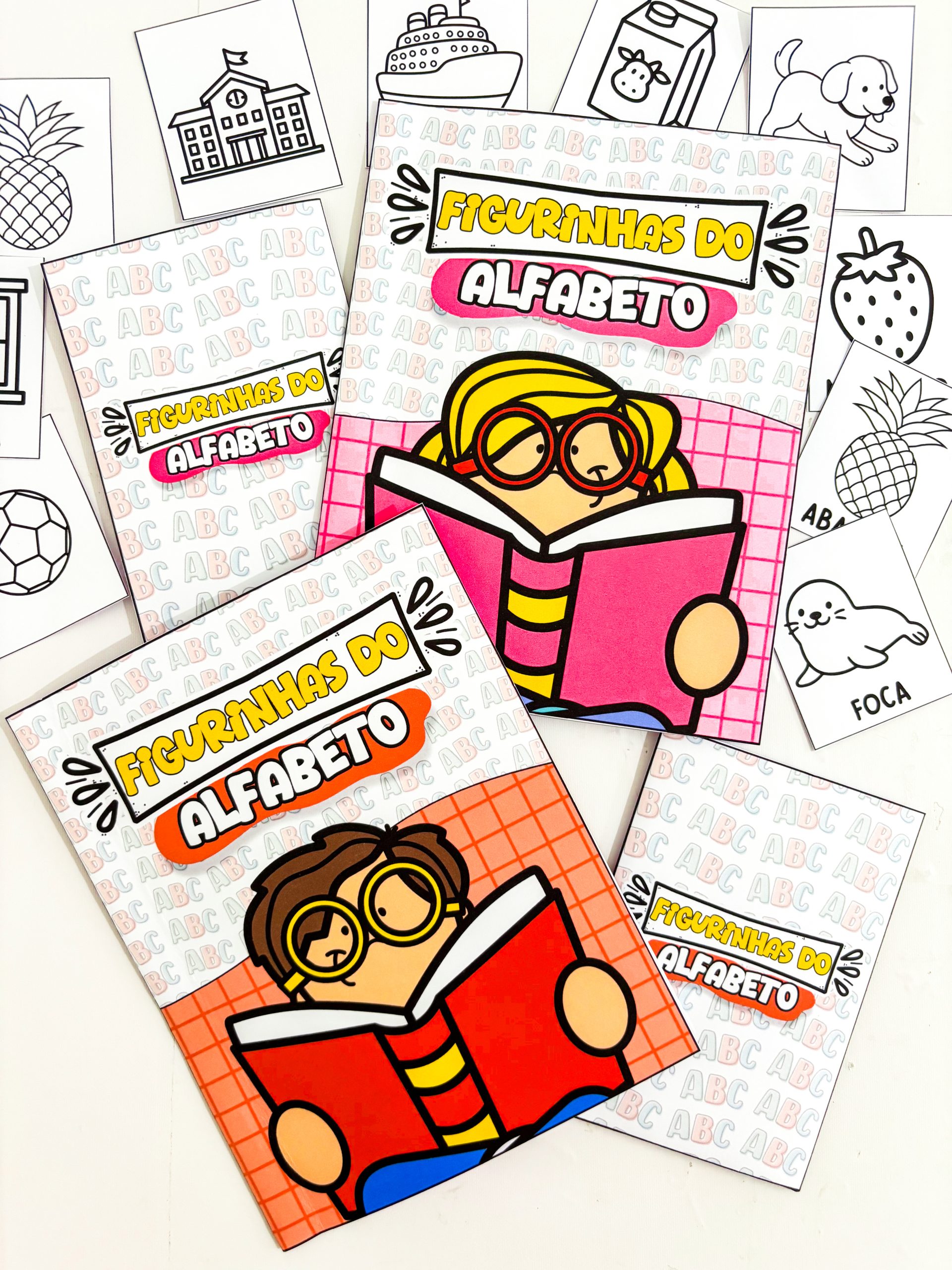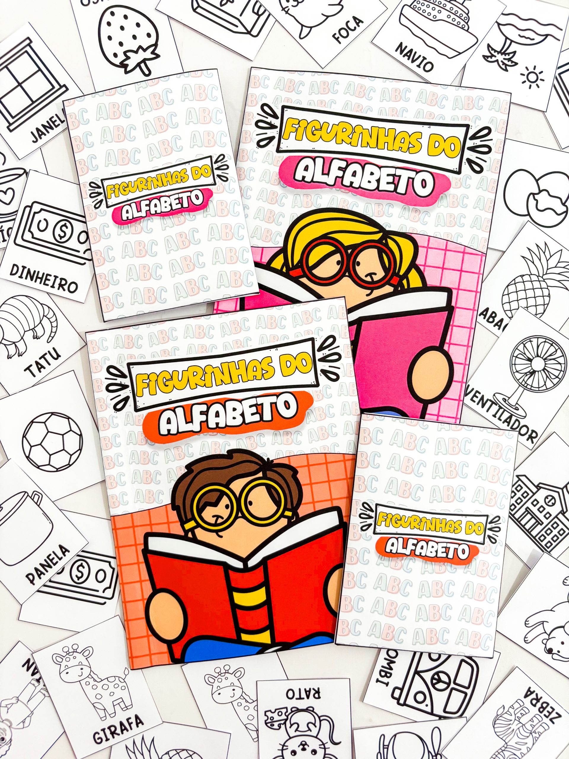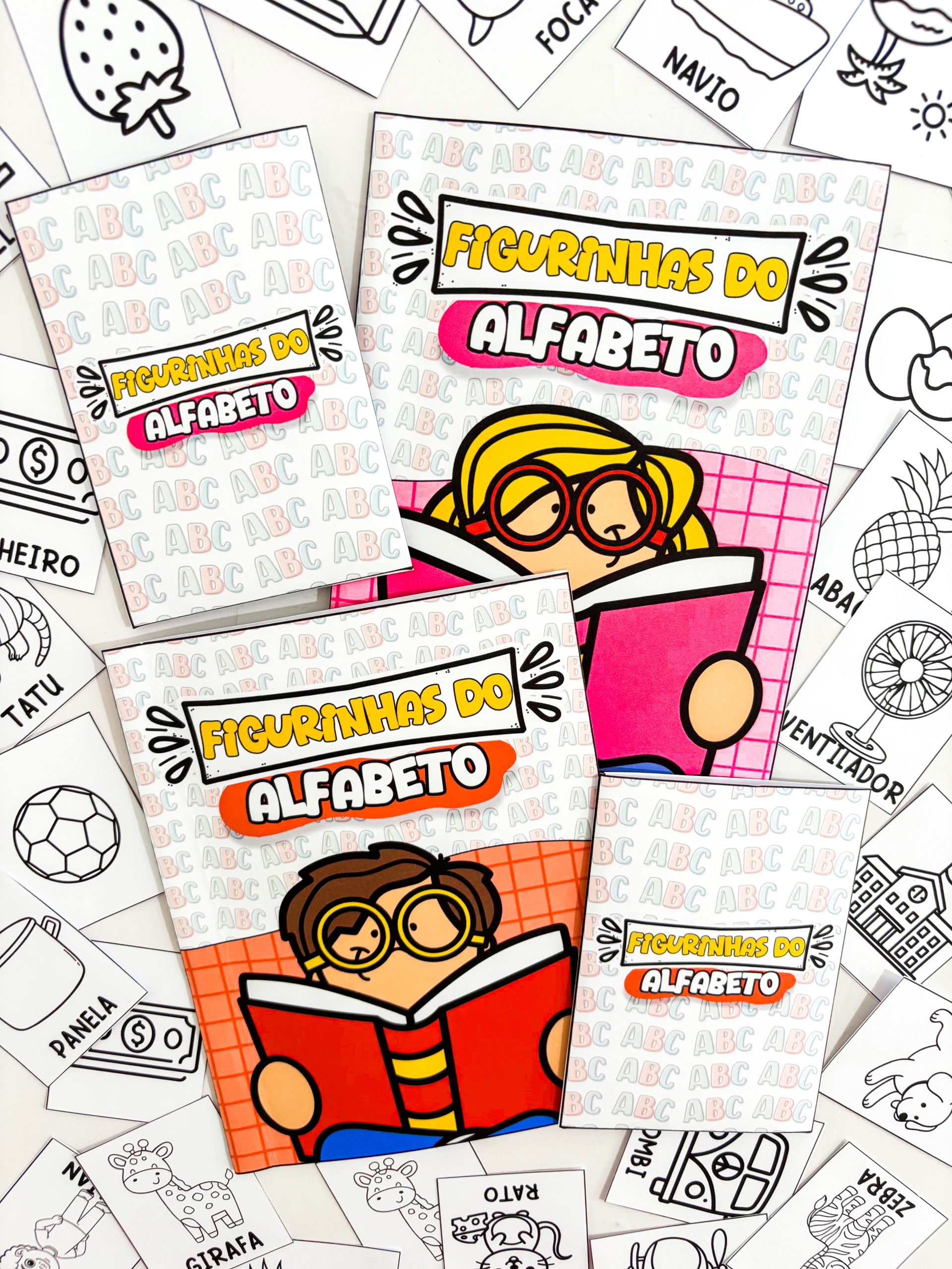 Imagina um álbum do alfabeto com capa colorida, páginas organizadas letra por letra e figurinhas fofas para colorir, onde cada criança constrói o seu próprio caminho na alfabetização. 💛✏️