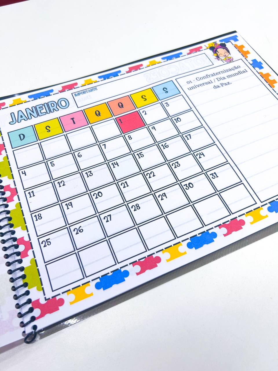 Um calendário completo, mês a mês, com todas as datas comemorativas importantes. Planeje, organize e acompanhe suas metas ao longo do ano com um espaço exclusivo para anotações, reflexões e objetivos mensais.