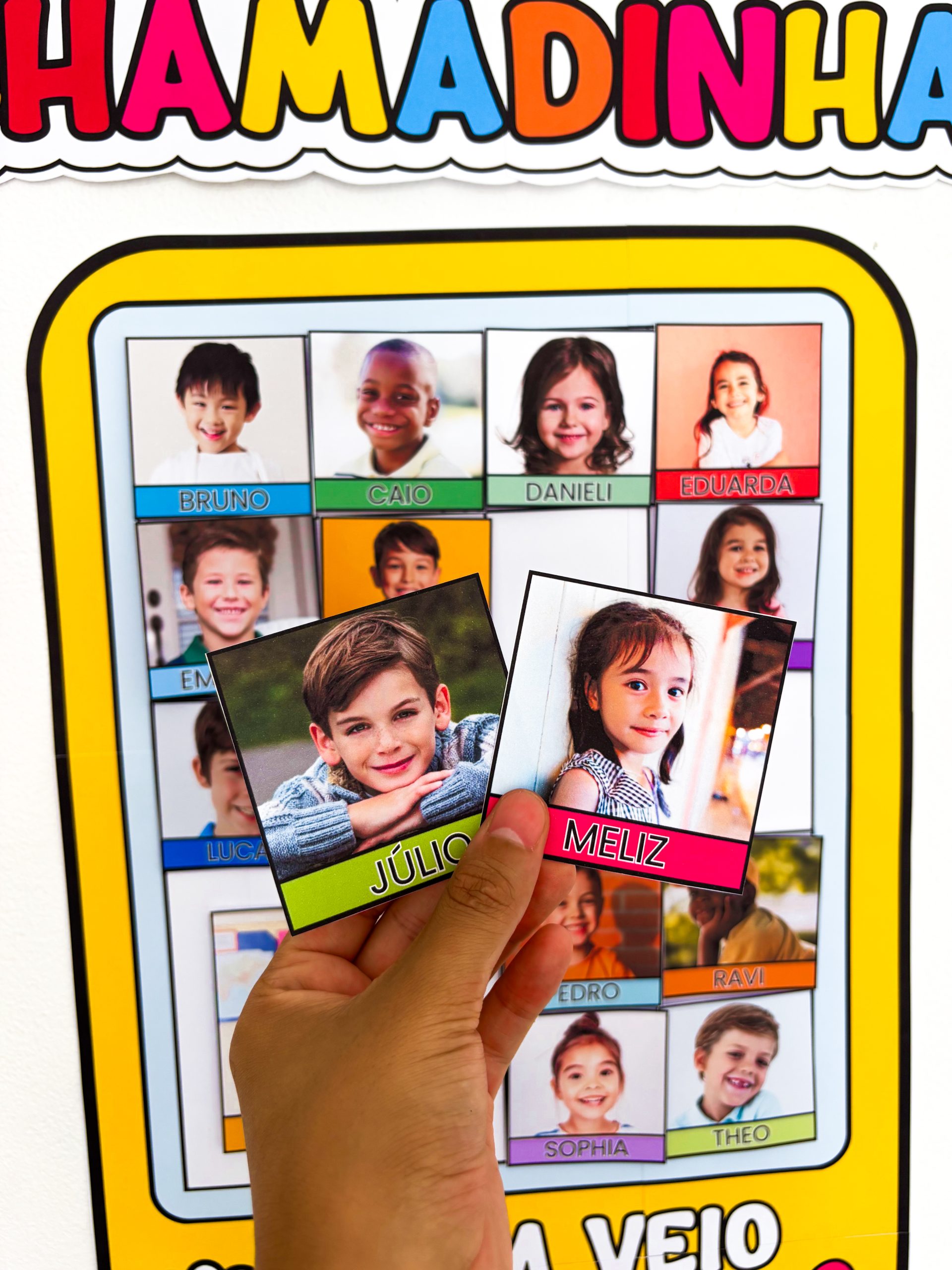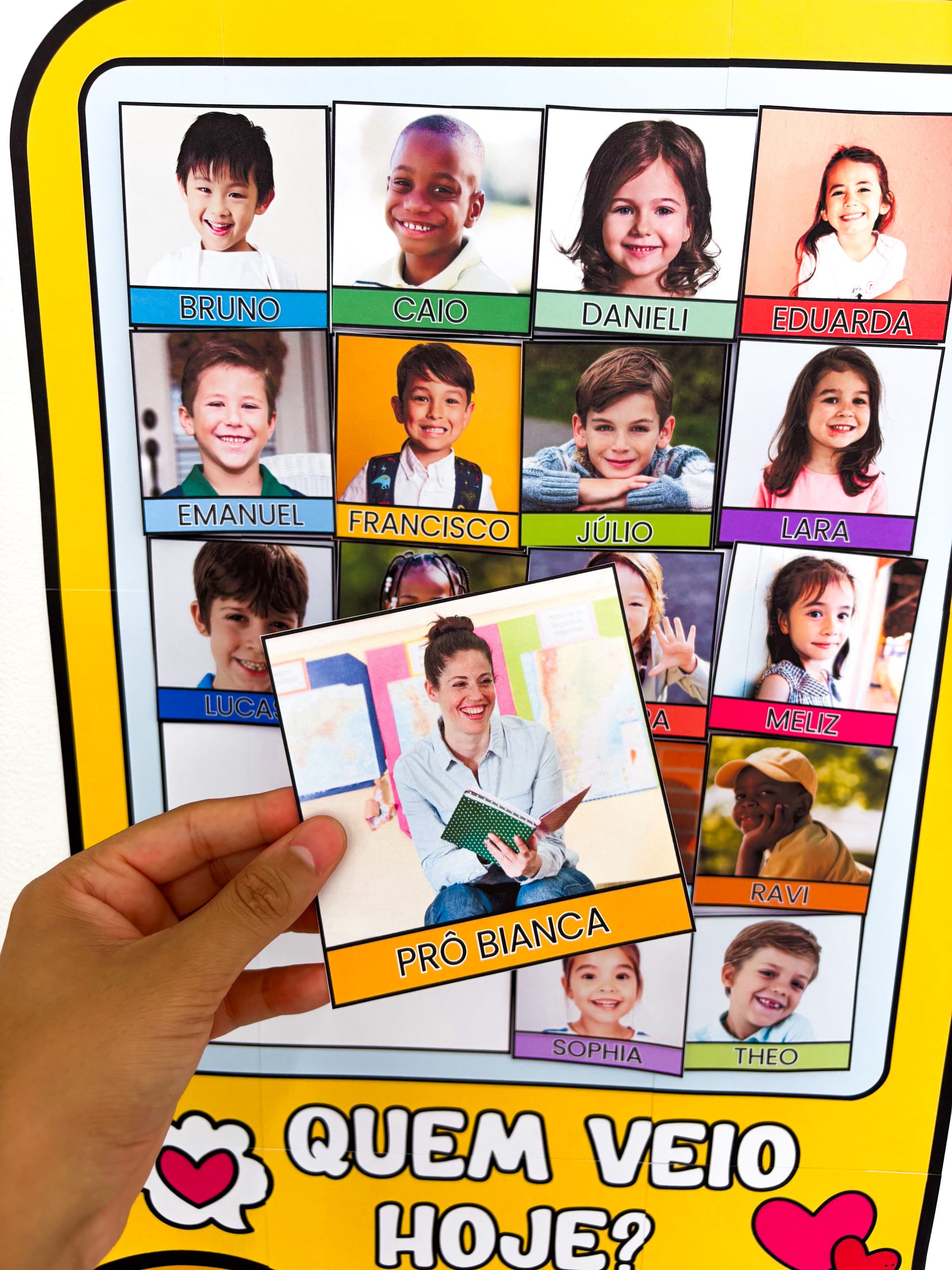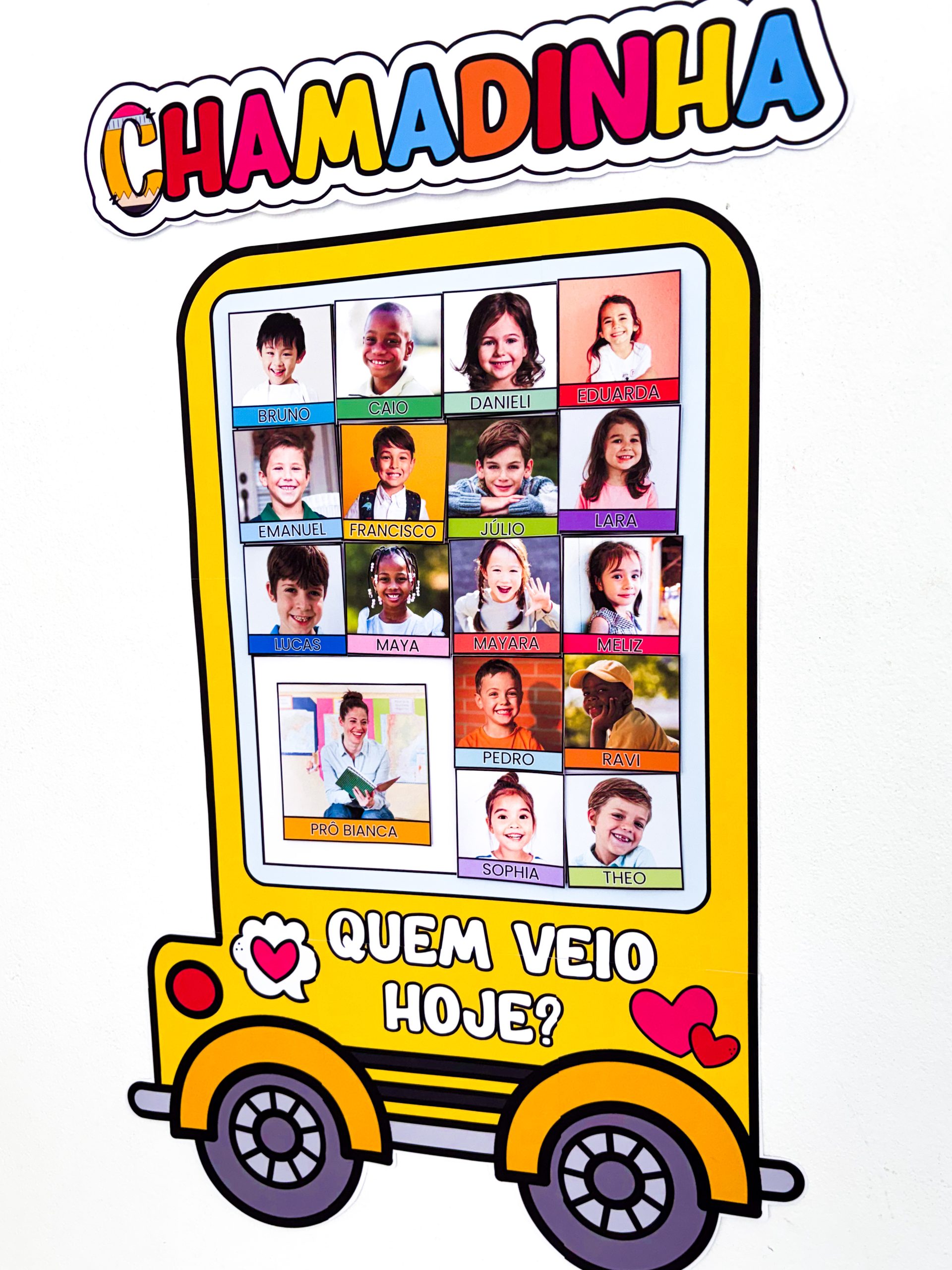 E nele só entra quem faz parte. Essa chamadinha com foto no formato de ônibus transforma o momento da presença em algo que a criança vive, participa e se reconhece.