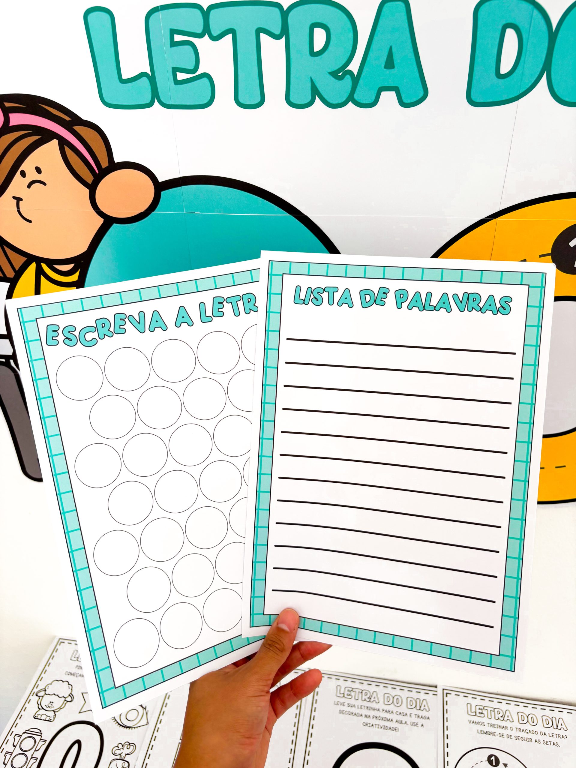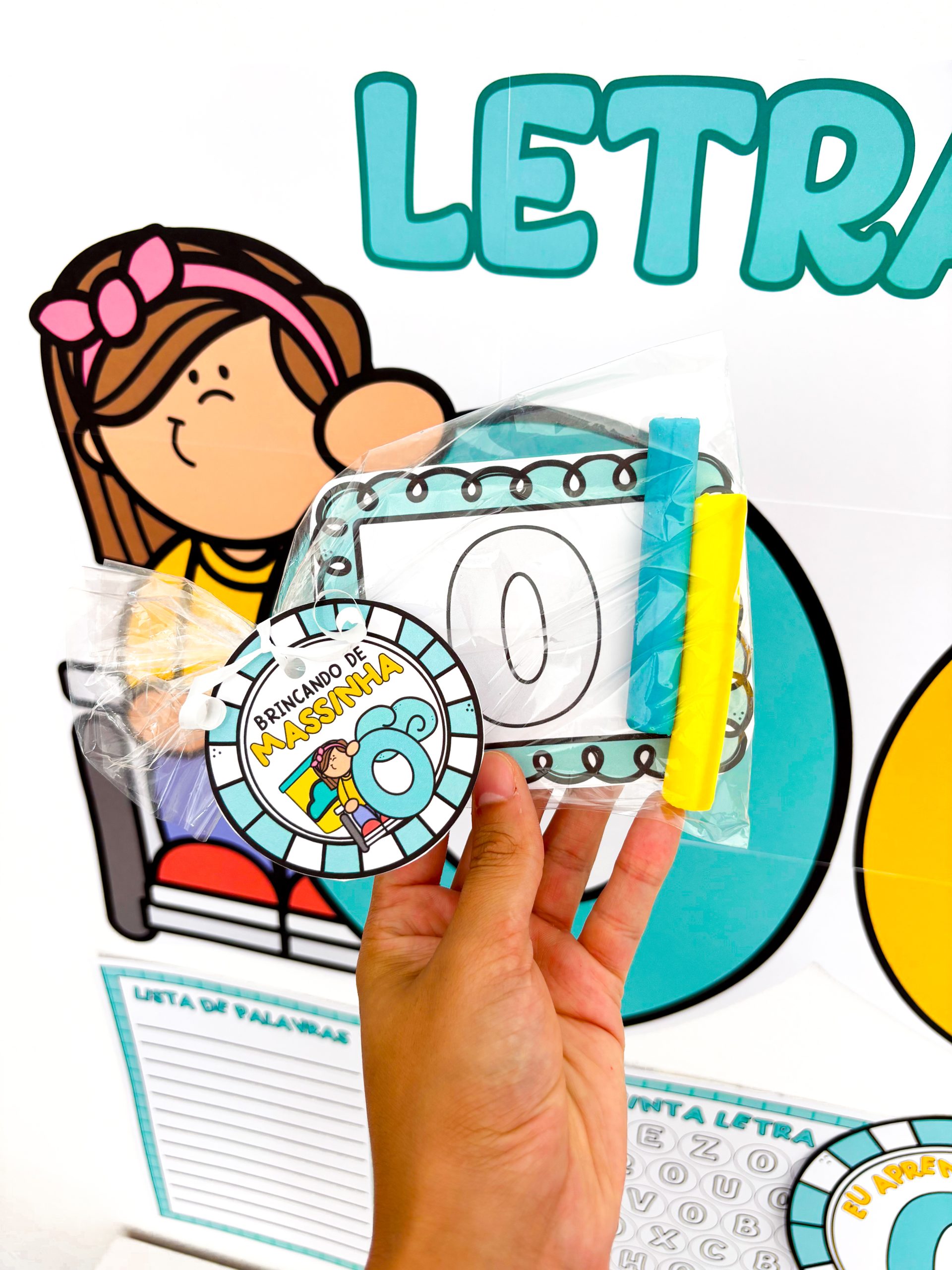 🎁 Lembrancinha “Brincando de Massinha” com fichas e lapela para enviar as 4 formas da letra e treinar em casa