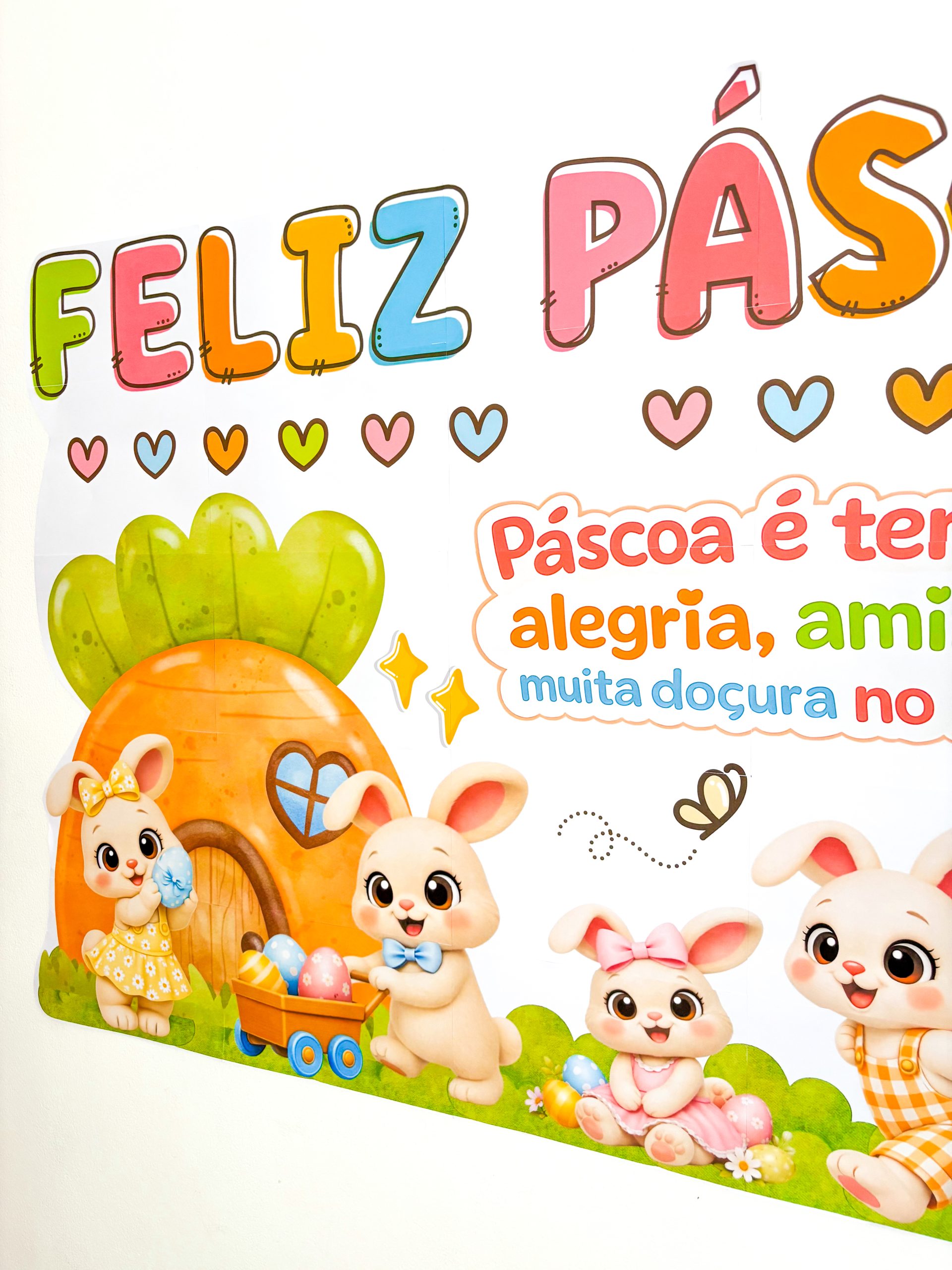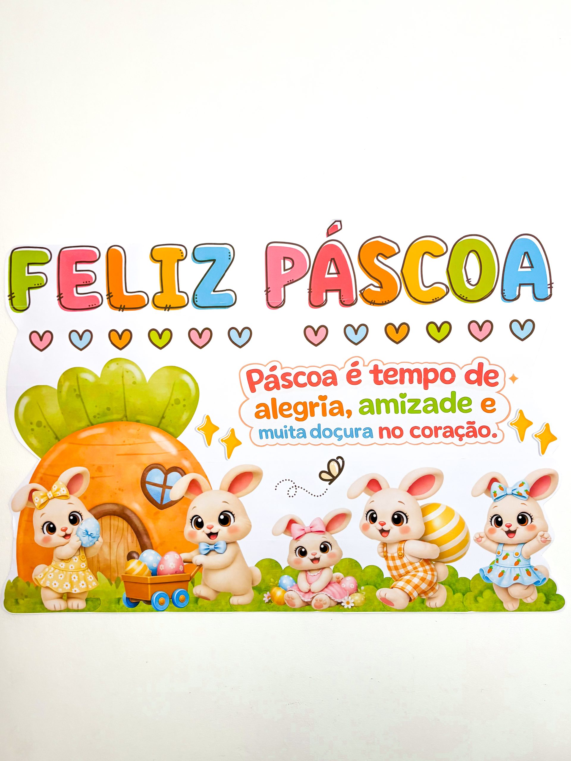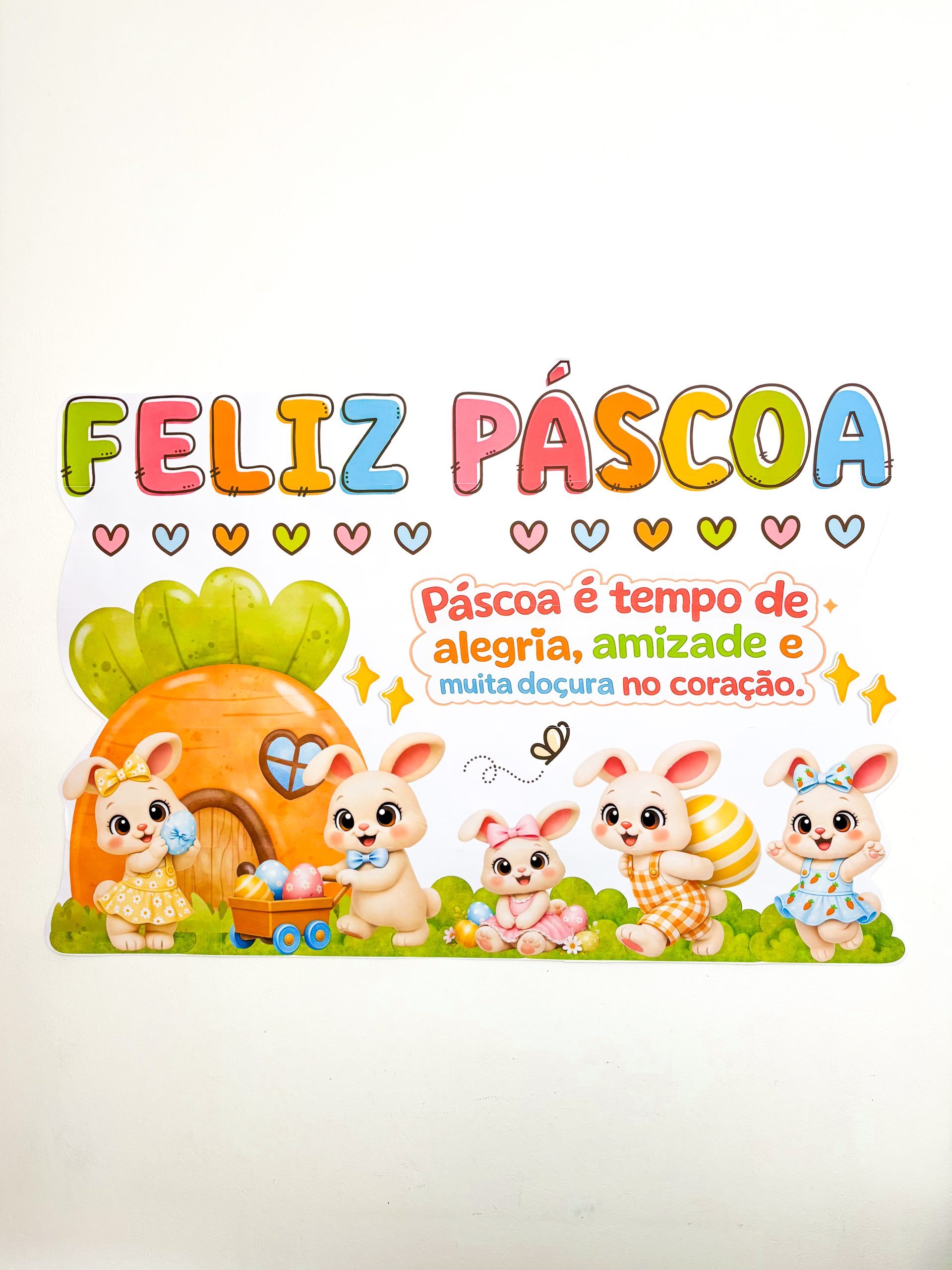 As letras coloridas trazem leveza, os coraçõezinhos completam a composição e os coelhinhos com a casinha de cenoura criam uma cena que parece saída de uma história infantil.