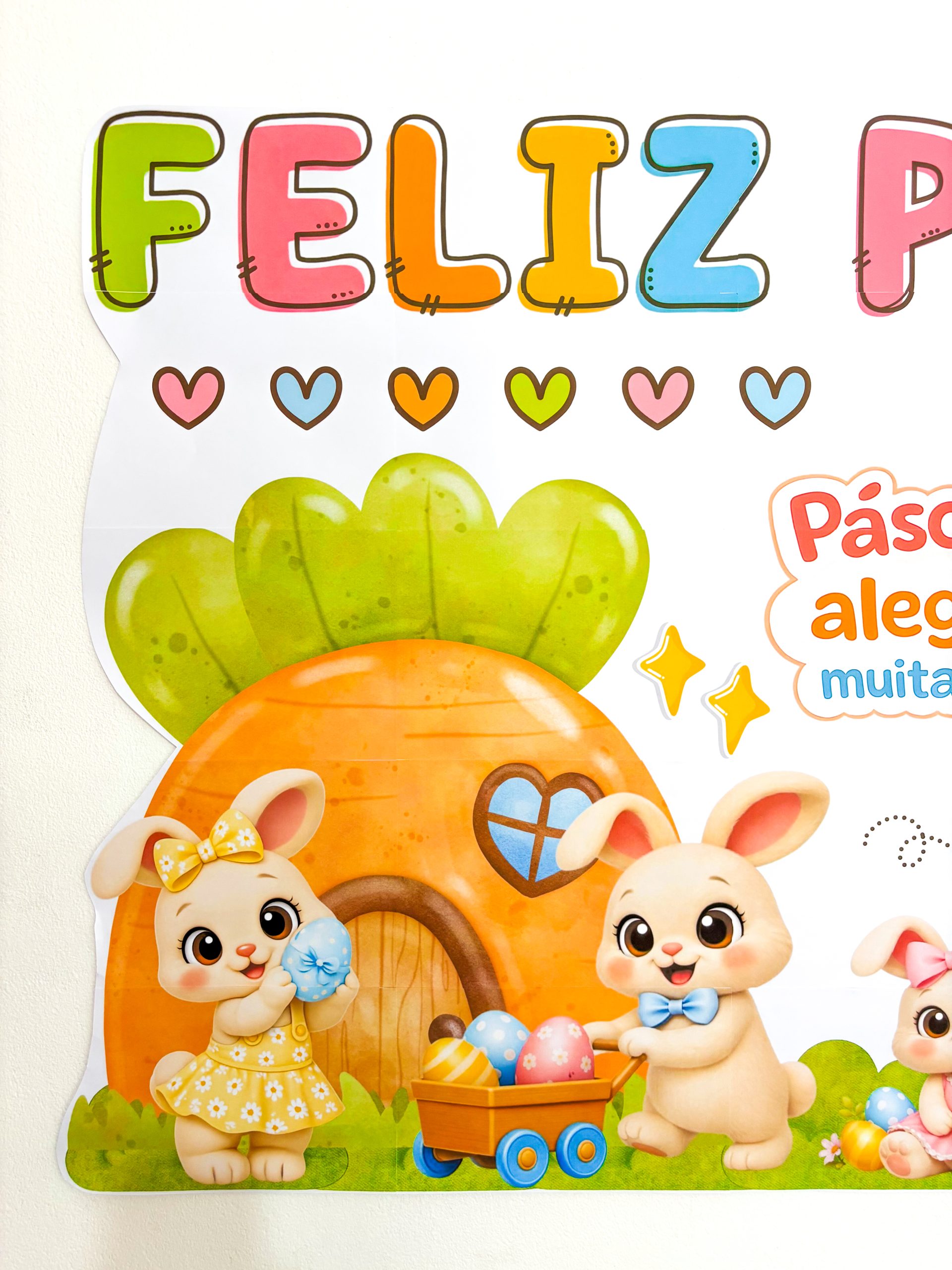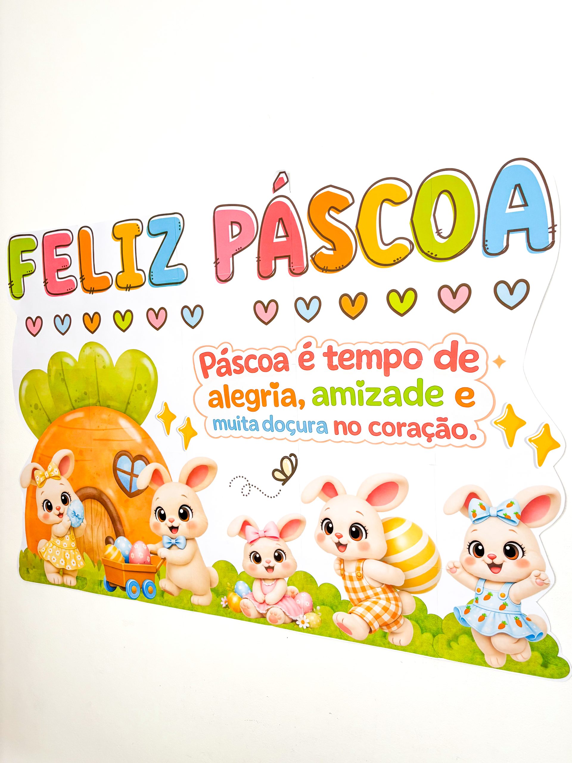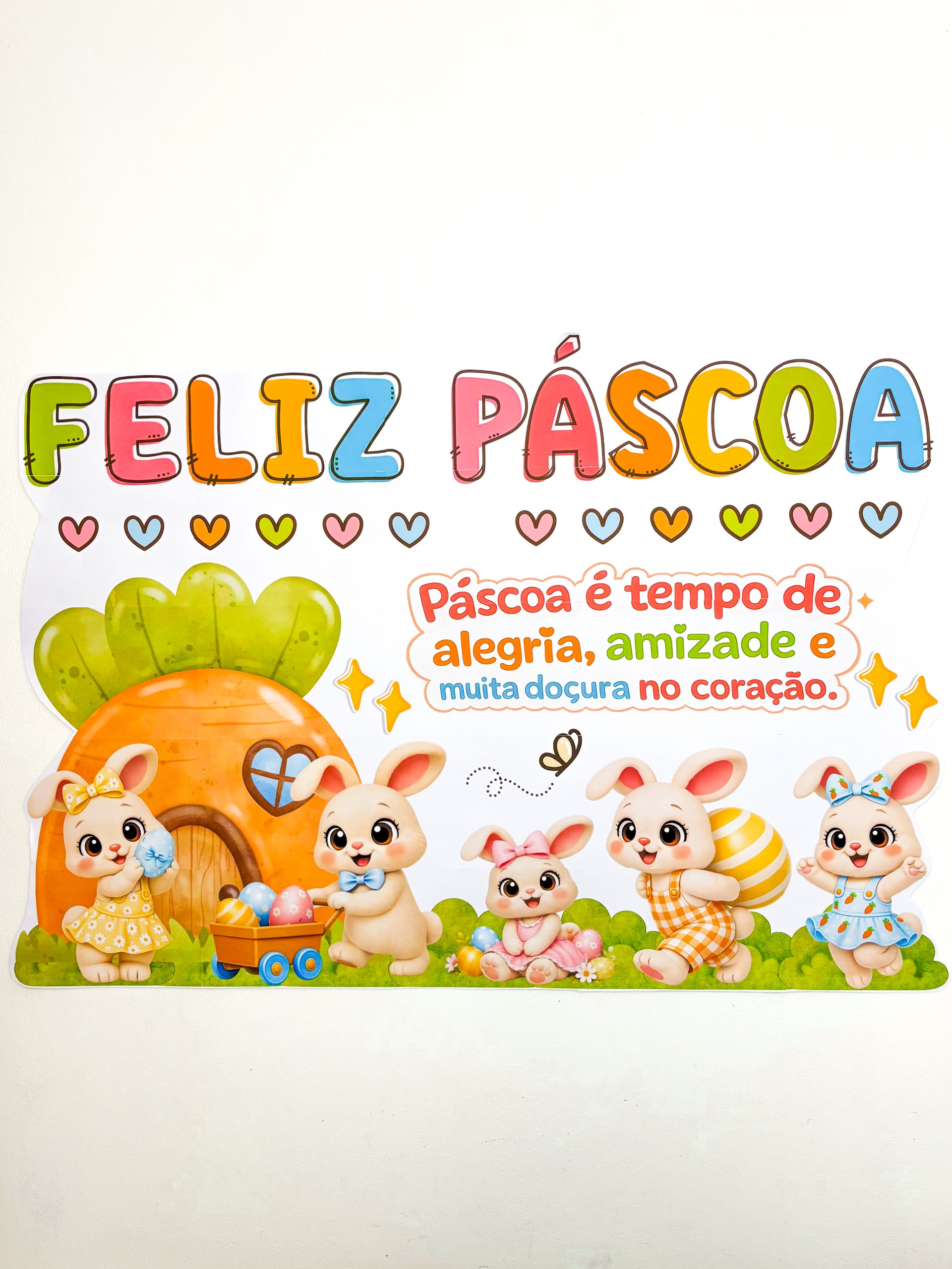 As letras coloridas trazem leveza, os coraçõezinhos completam a composição e os coelhinhos com a casinha de cenoura criam uma cena que parece saída de uma história infantil.