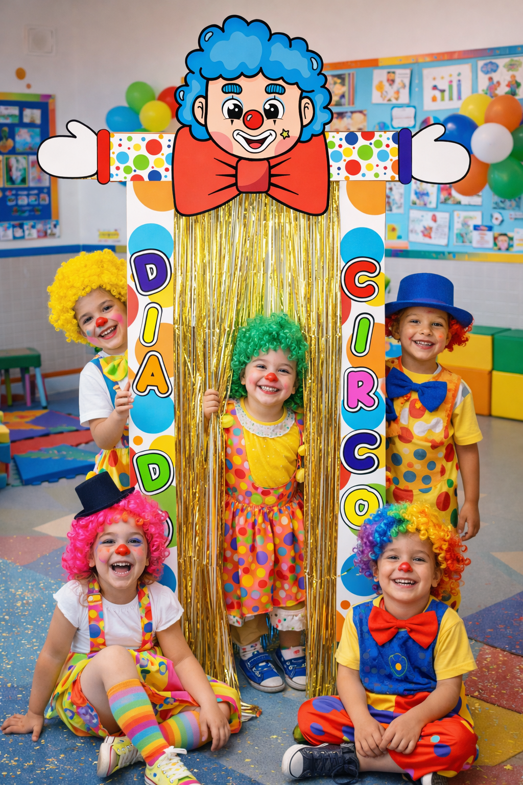 Imagine seus pequenos vestidos de palhaçinhos, sorrindo ao redor desse painel cheio de cores e diversão… é sucesso garantido! 🤡✨